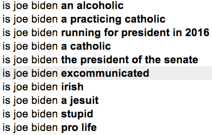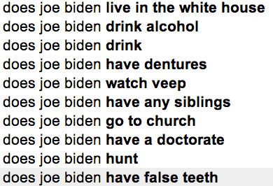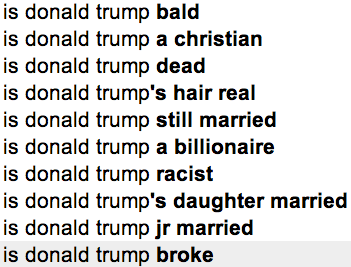 You can use Google Prompts to find out what questions the public is asking. For example, just type in "Is " followed by the name of a celebrity. Let's find out what the Undernews is about 2016 Presidential Timbers. (Sorry about getting screenshots to display as different sizes.)