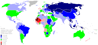Click on the map to see the full size version. The key reads that Navy Blue countries have over 3 times as many female relatives of American citizens being brought into America as males. Medium Blue countries are 2x. At the other end of the scale is Dark Red.
